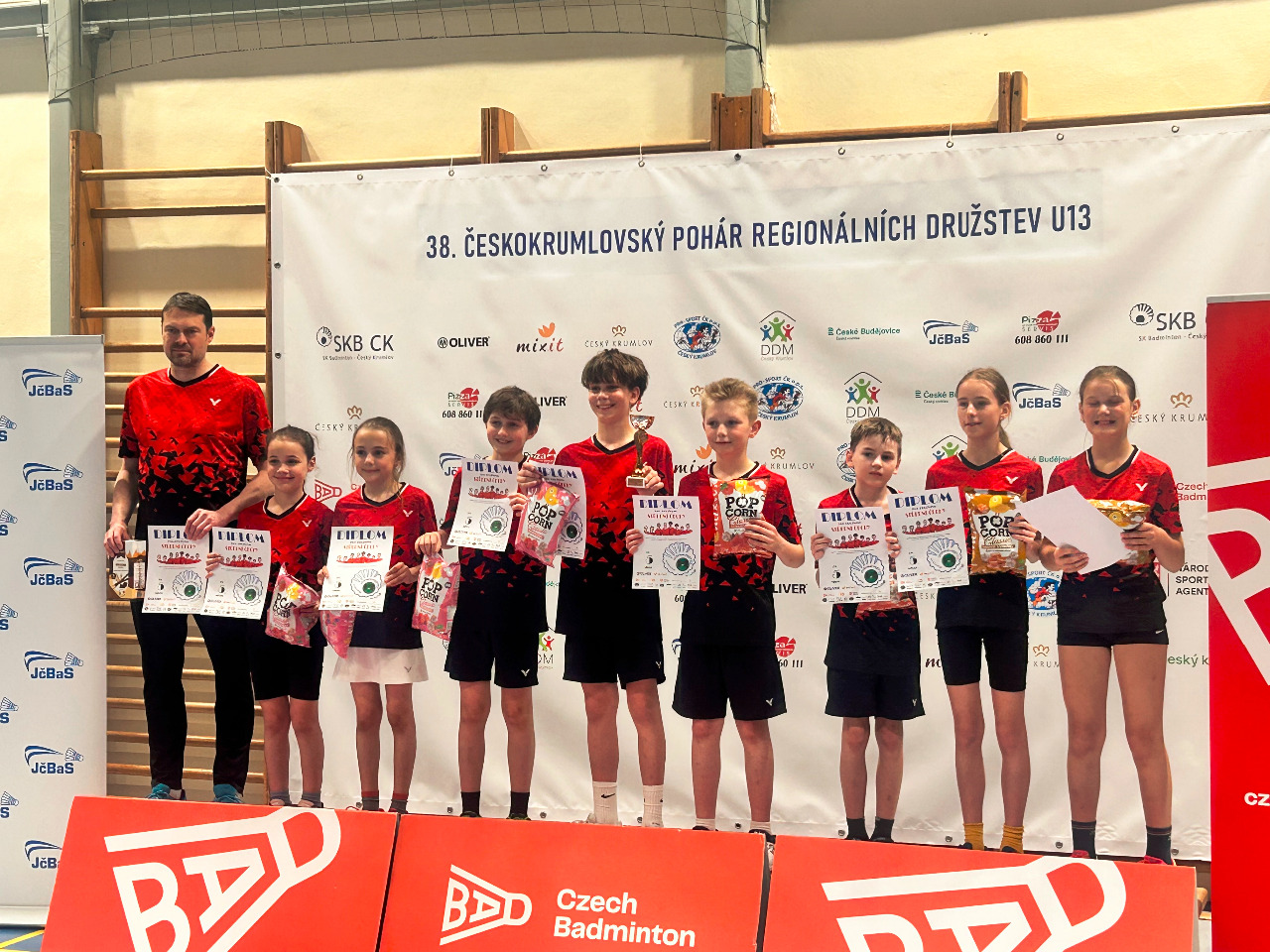 27.04.2026 18:32Celý víkend 25.-26.4. se nesl v programu soutěže regionálních výběrů v kategorii U13 v hale v Českém Krumlově. Skupina čtyř dívek a čtyř kluků reprezentující pět různých oddílů Středních Čech vstupovala do turnaje ze 7. místa. Náš klub do nominace výběru vyslal Stelu Náprstkovou. Během dlouhé soboty se rozhodovalo, do jakého pavouka v neděli nastoupí, bohužel skončily ve skupině „B“ (s celky Jižní Čechy „A“, Jižní Moravou a Severními Čechy) třetí a tudíž hráli o 5.-8.místo. Nutno říci, že v obou skupinách byly velmi silní soupeři jako celky Prahy, Jižních Čech nebo Moravy. Naštěstí všechny děti zvládly odpoledne načerpat své síly a v neděli naskočit do pavouka, kterého s přehledem vyhrály, a tudíž obsadily krásné 5. místo.